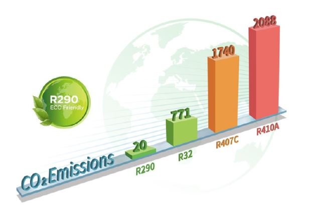 The new range of heat pumps is available with R290 refrigerant, which is pure propane and has a very low environmental impact and can reach temperature up to 75°C. R290 is the preferred hydrocarbon alternative of the Environmental Protection Agency (EPA).