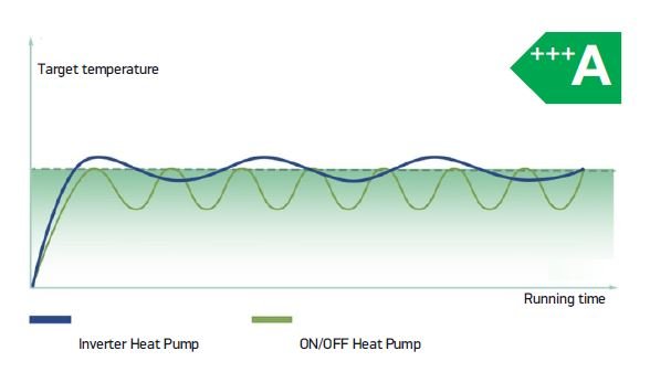 Due to the full inverter technology of the compressor and fan, it can modulate to low frequency when set temperature is reached in order to maintain minimum heat losses of the house.